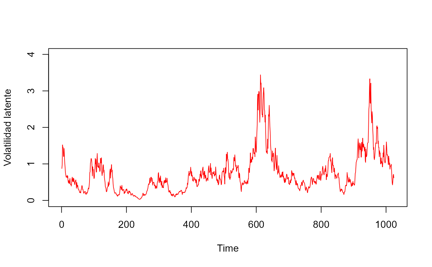 plot.ts(exp(x1/2), ylim = c(-0.01, 4), ylab = 'Volatilidad latente', col = 'red')