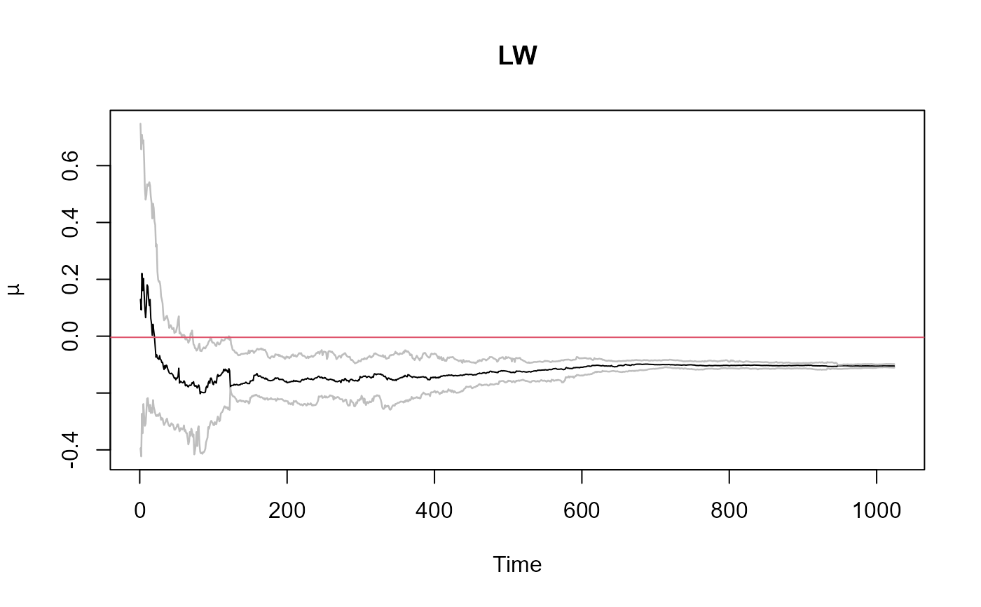 ts.plot(malpha1, ylim = range(lalpha1, ualpha1), main = 'LW', ylab = expression(mu))