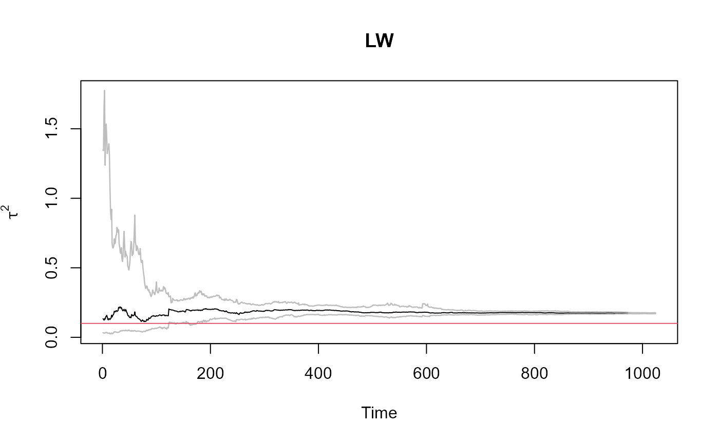 ts.plot(mtau21, ylim = range(ltau21, utau21), main = 'LW', ylab = expression(tau^2))