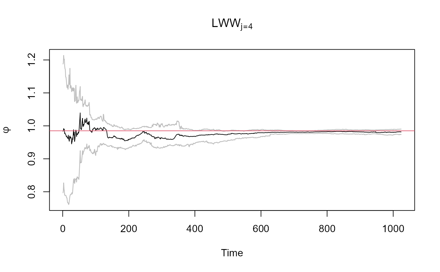 ts.plot(mbeta2, ylim = range(lbeta2, ubeta2), main = expression(LWW[j==4]), ylab = expression(phi))